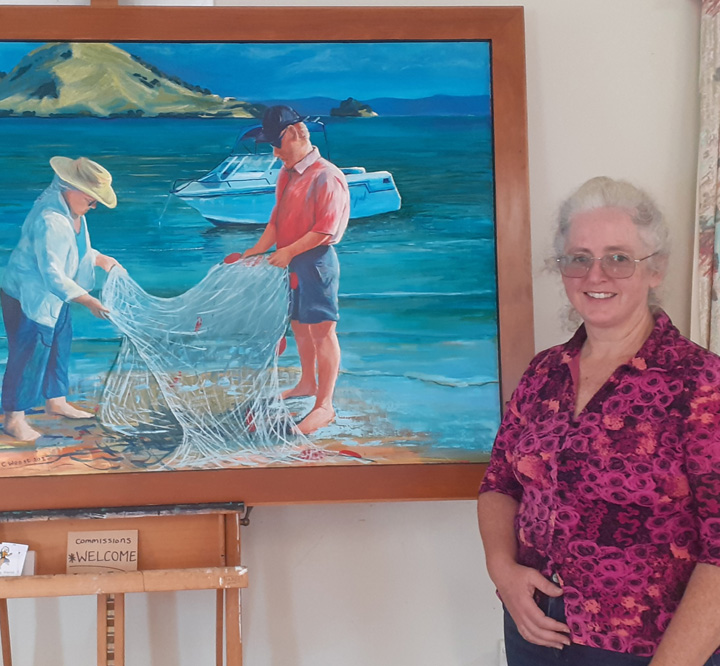 For Cindy, the most fulfilling aspect of her work is creating commissioned pieces that resonate deeply with her clients, bringing joy, cherished memories and beauty to their everyday lives. Living amidst the breathtaking scenery of Whangarei Heads, Cindy immerses herself in its landscapes, capturing the essence of this place in many of her paintings. Her art is driven by the interplay of colour and light, captured through painterly realism. One of Cindy’s most famous paintings is Jess in the tide – a large 102 x 77 cm oil on board painting of Jess standing in the incoming tide of the Taiharuru inlet, near Pataua South. “It was a beautiful day, and the sun was glistening off the incoming tide and illuminating Jess’s back. I just had to capture the memory” Cindy explains, “The painting is a symbol of a special family day spent exploring the Northland coast. I’ll treasure it forever.”