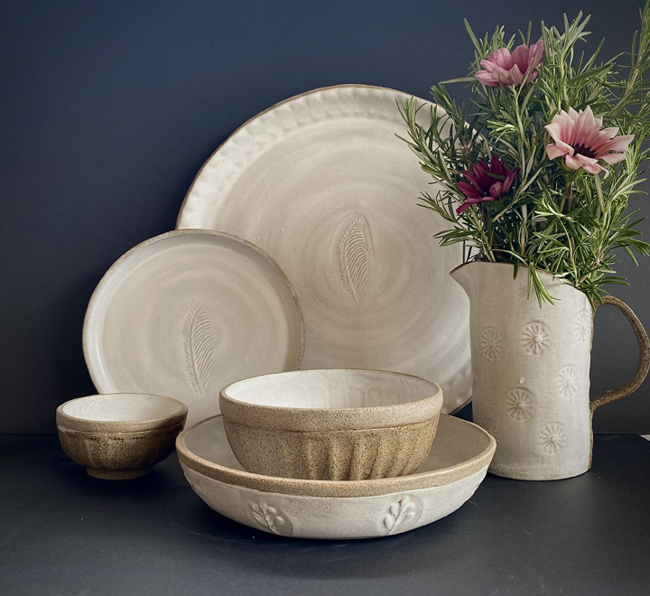 Paula’s ceramic work is entirely hand-built, starting from a slab and lovingly shaped into unique homewares, wall hangings, and garden totems. She imprints patterns using her own custom-designed stamps and employs the sgraffito technique to add depth and detail. Glazing plays a vital role in her creations, with colour as her driving force – each finished piece is a surprise, shaped by the nuances of glaze application and kiln firing temperatures.